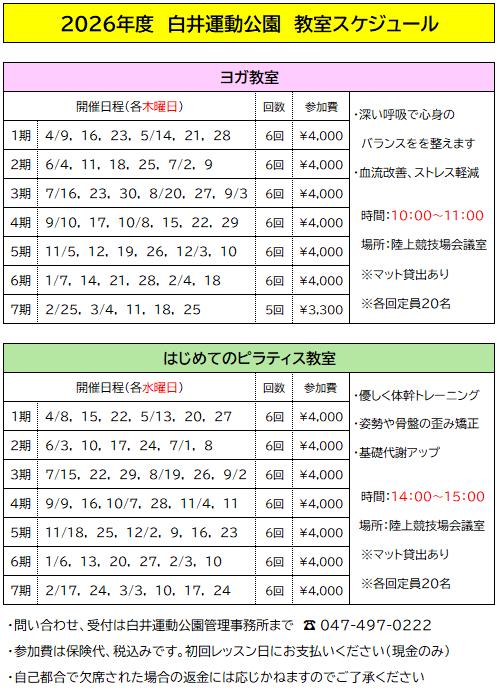 2026年度 ヨガ教室、ピラティス教室のご案内
